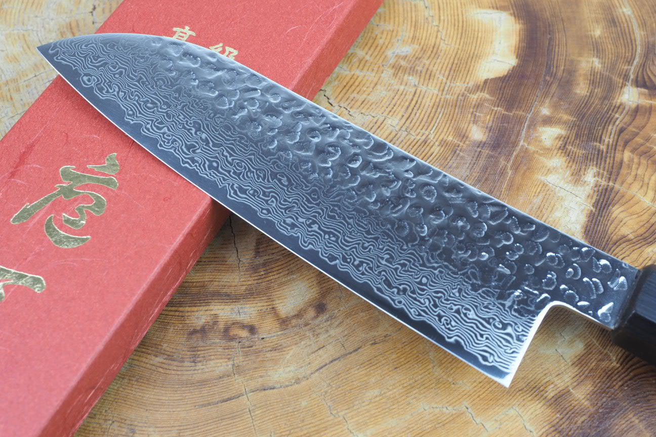 Sakai Jikko "Loco Damascus Black" Wa-Santoku Knife SG2 Powdered High Speed Steel Damascus Hammered Finish with Black Japanese Oak Handle (16.5cm)