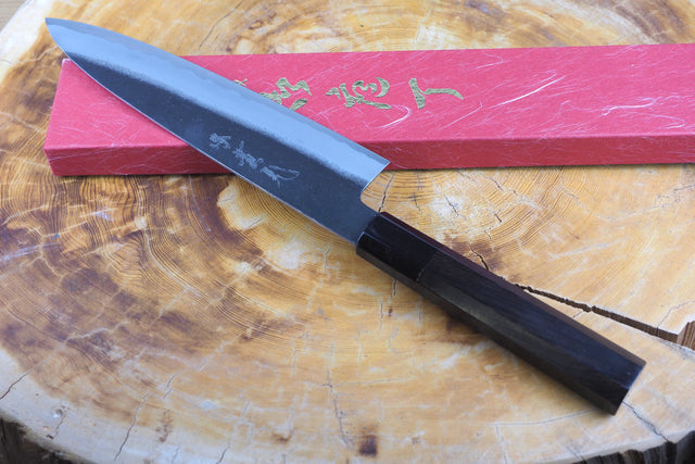 Kurouchi(黒打)is a type of knives that are only polished the edge line and left with black residue appearing after forging and quenching. The black part of every Kurouchi looks different to each other and shows a little imperfection in their looks. However, this rustic design is aesthetically pleasing to eyes and feels traditional craftsmanship.