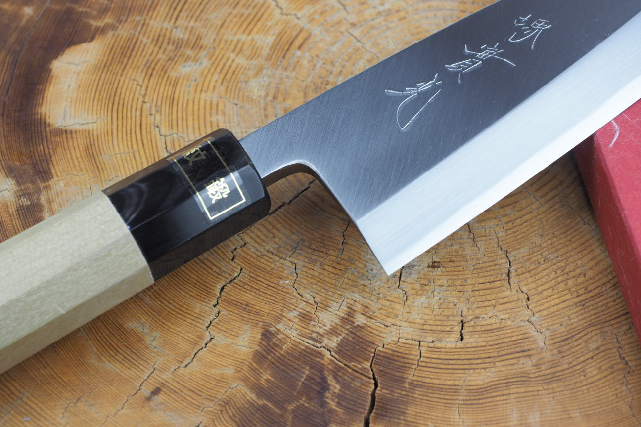 Blue Steel (青鋼)is known as the highest sharpness and durability. Above the level of White Steel, Blue Steel contains smallest impurities as well as additional chrome and tungsten which makes the knives strong to wear and tear. With this mixture, Blue Steel is an ideal material for Japanese cutlery products.