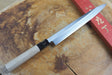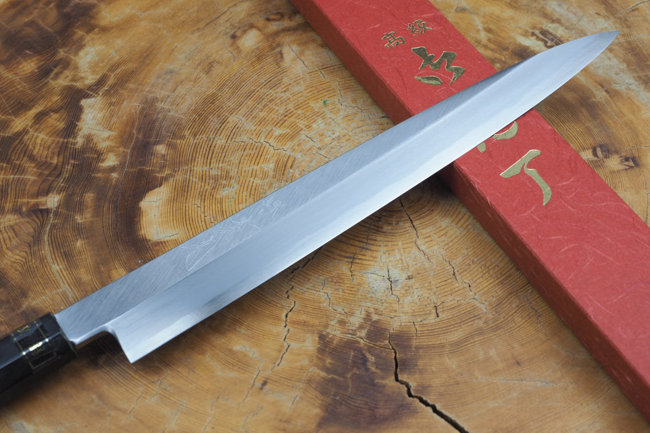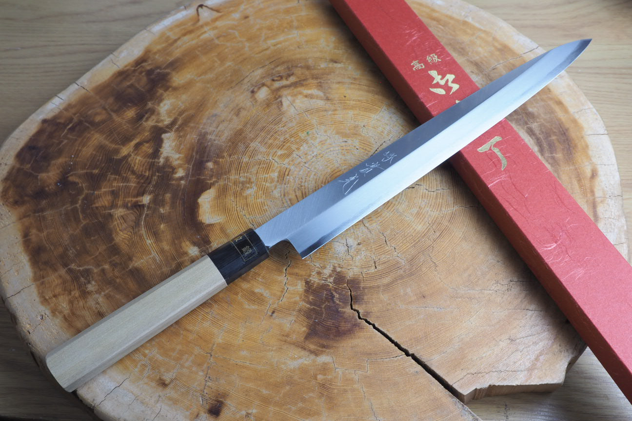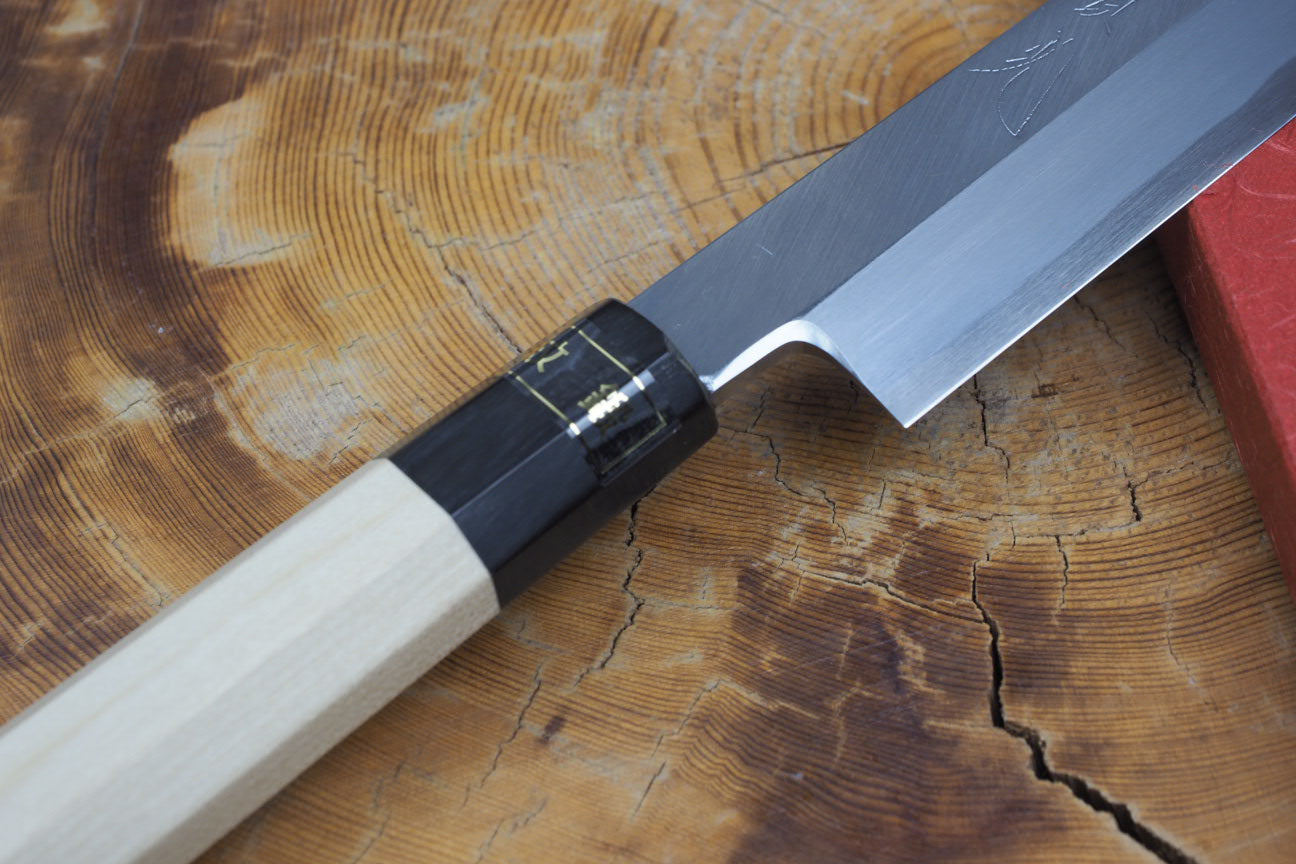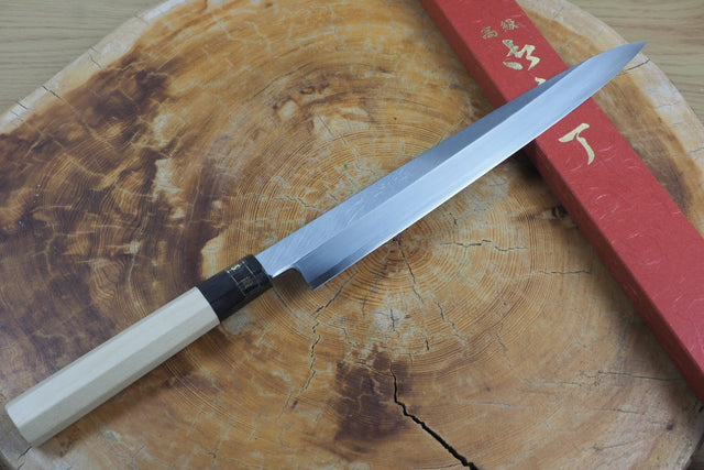 A Sashimi knife is to thinly slice raw seafood and filleted blocks into sashimi and the like. The Sashimi knife will make the last cut before the sashimi reaches the mouth, so if it is possible to use a better grade knife, it will cut beautifully clean edges for even more delicious sashimi.