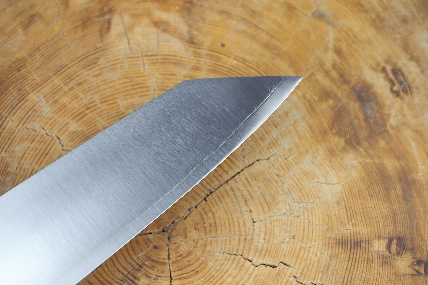 The blade of Kiritsuke knives has a different shape to normal Western knives. It is angular shape around the tip and straight line on the spine. This design is originated from rectangular Usuba knives and pointed Yanagiba Knives.