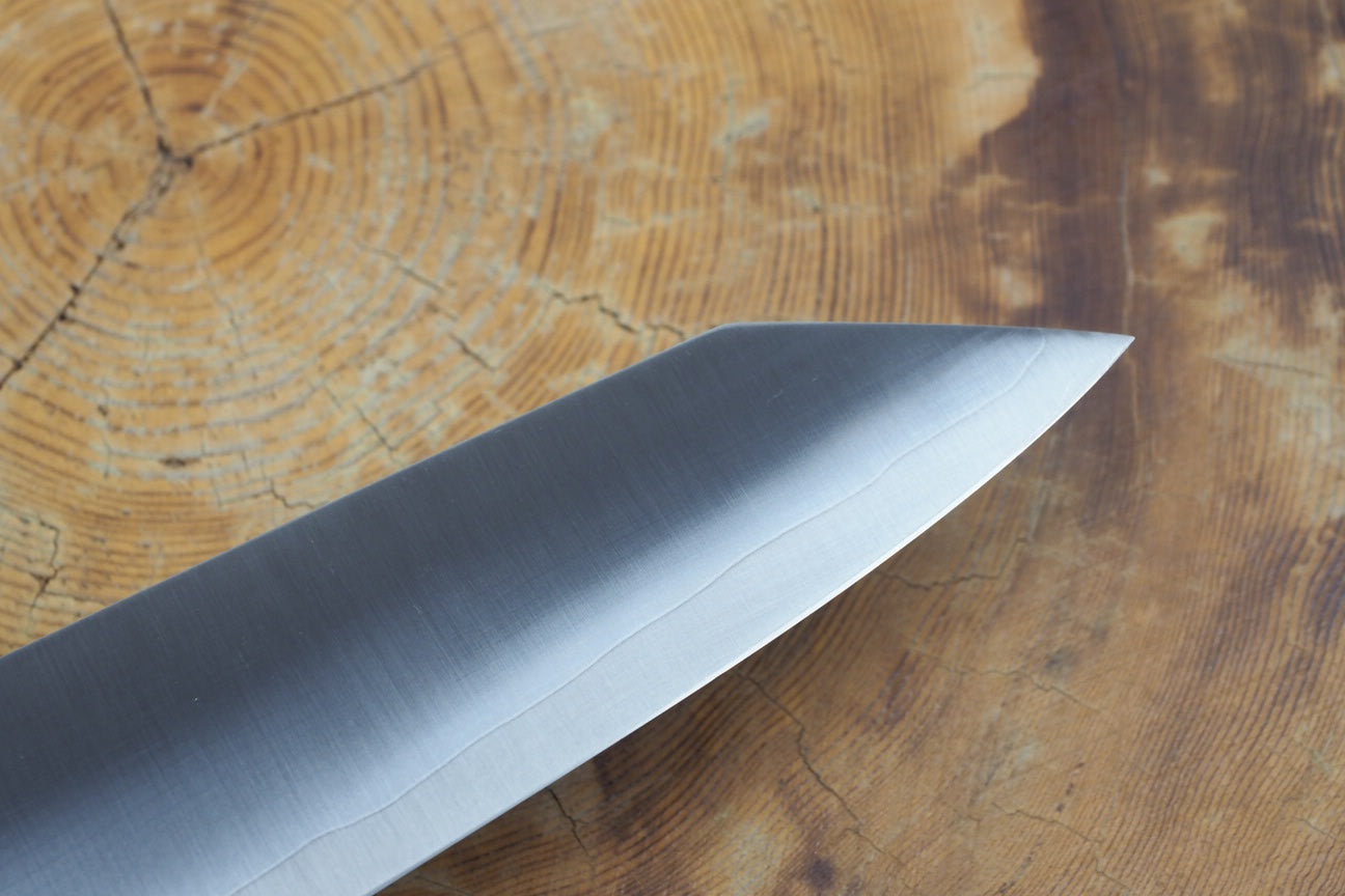 The blade of Kiritsuke knives has a different shape to normal Western knives. It is angular shape around the tip and straight line on the spine. This design is originated from rectangular Usuba knives and pointed Yanagiba Knives.
