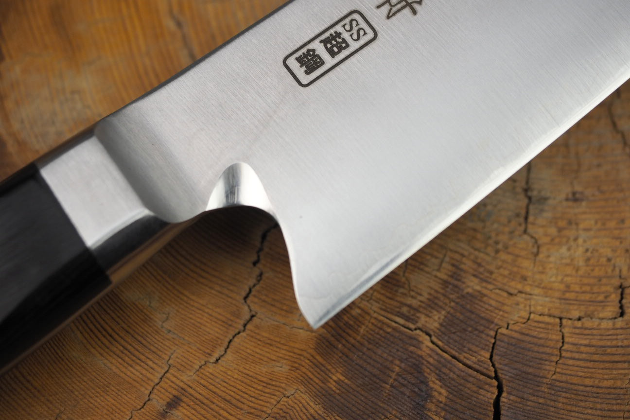 "Edo" refers to the old name of Tokyo (150-400 years ago). "Edo-Togi grinding" is a traditional Japanese single-edged (Kataba) knife shaping technique applied to Western double-edged knives. In contrast to general double edged-knives with 50:50 blade bevel, "Edo-Togi" features 70:30, with one side nearly vertically ground and the other side ground to a clam shape (commonly known as Hamaguri-ba). This unique shape allows TOSHU knives to ensure exceptionally thin cutting edge and durability at the same time.