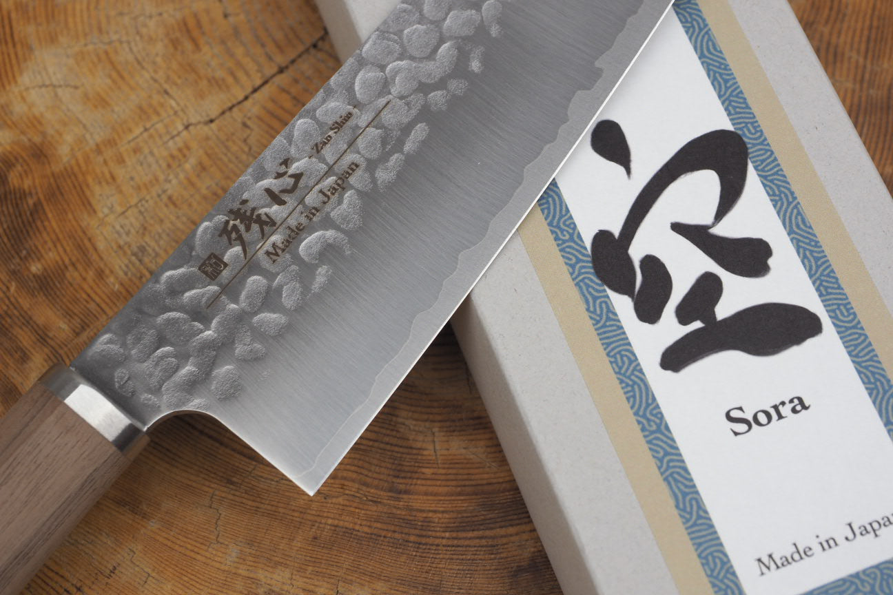 The meticulous craftsmanship includes a large Kireha (edge line) and an intricately hammered pattern for an elegant touch. Compared to the Zan Shin Ao series, the Sora series boasts a thinner blade, enhancing sharpness while requiring gentle handling to prevent chipping. However, its notable advantage lies in easy restoration and resharpening using mid-grain whetstones.