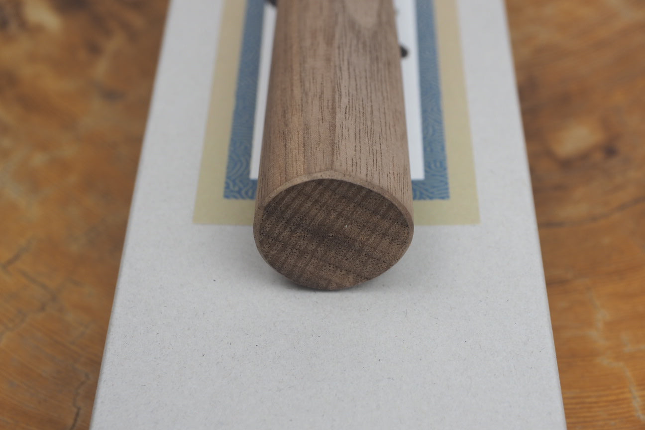 The walnut handle not only offers a natural feel but is also enhanced by a silver bolster, effectively preventing water ingress. Its double-sided chestnut shape ensures versatility for users, accommodating both right and left-handed individuals with maximum comfort.