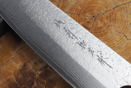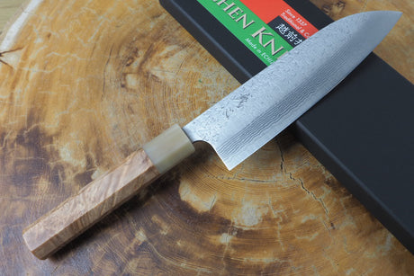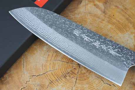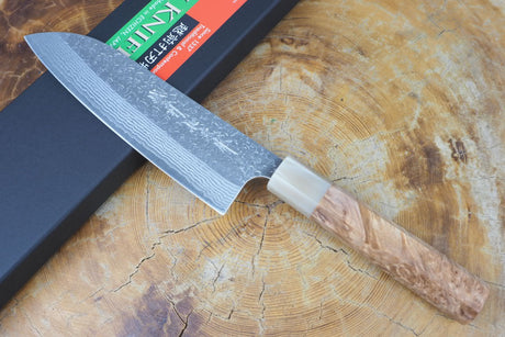 Kamo Knives - Hand Forged VG10 Damascus Hammered Santoku Knife 16.5cm with Quince Wood Handle