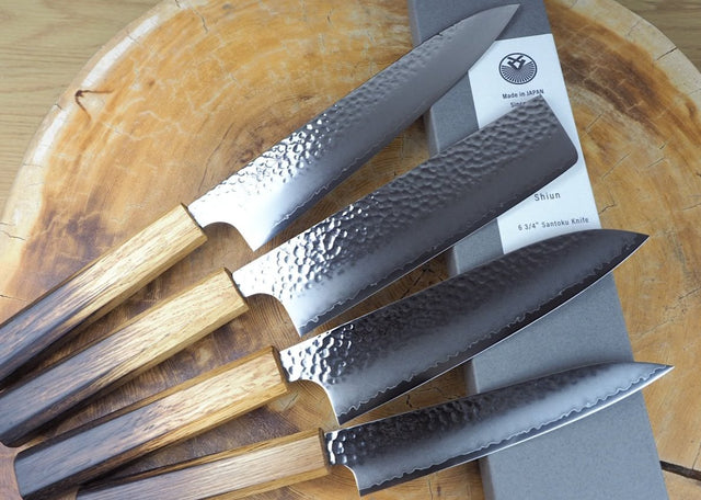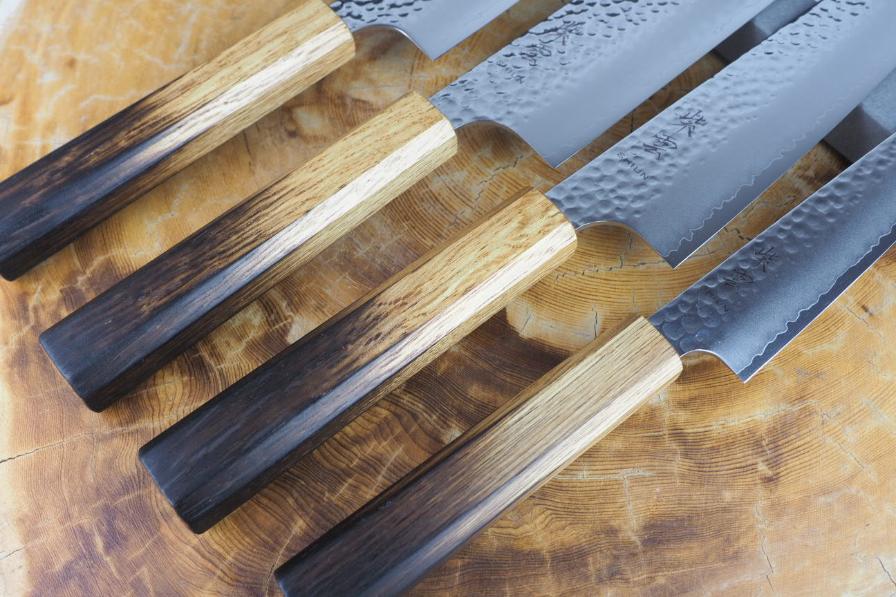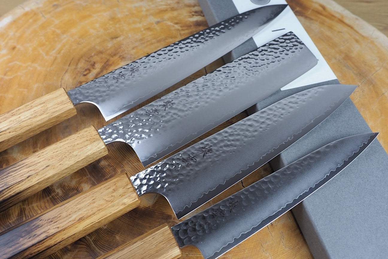 Seki Kanetsugu - Shiun 4 knife Set VG10 Steel Burnt Lacquer Handle Gyuto, Santoku, Nakiri and Petty