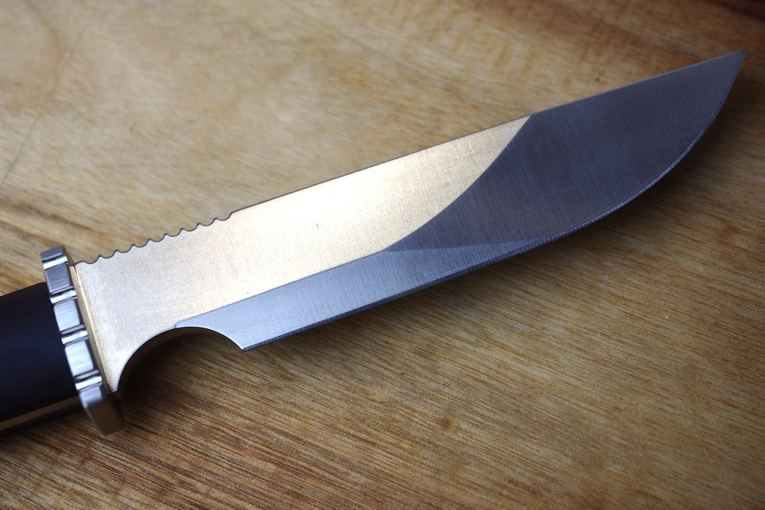 This camping knife has the thicker blade toward the handle and thinner blade toward the tip, allowing rough work for bushcraft and delicate work for food ingredients.