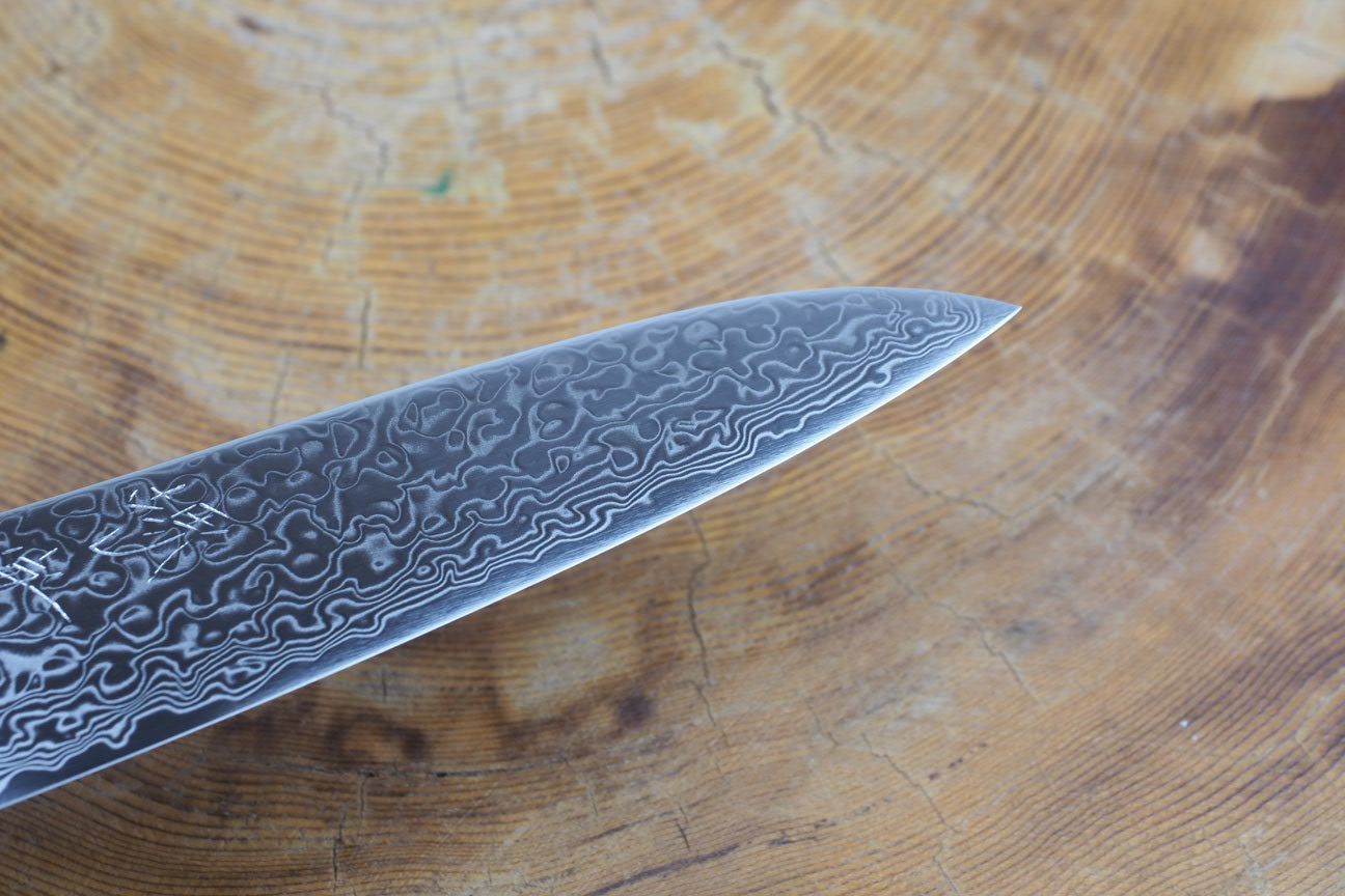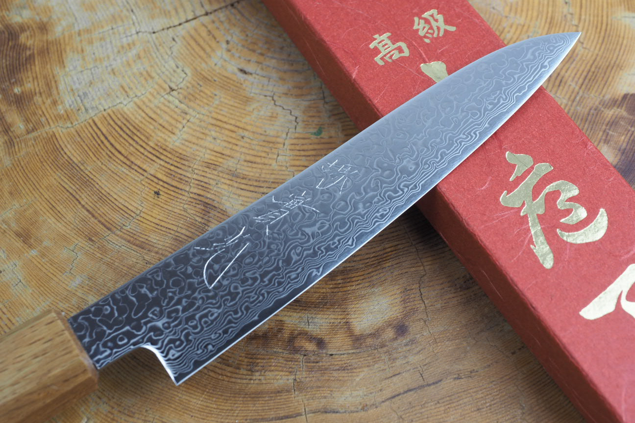 Impressive design with beautiful 65-layer nickel damascus mirror polished blade, as well as the stylish curved spine. Available only at Kaz's outside Japan.