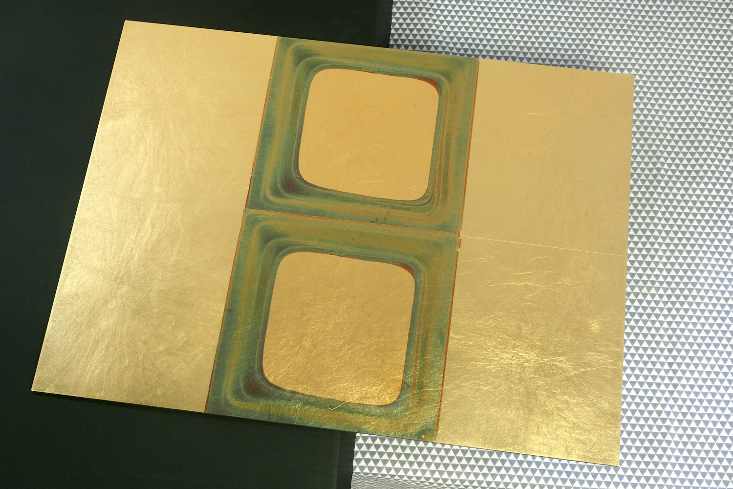 Kodai-haku is the original Kanazawa leaf made by Hakuichi in Kanzawa, Ishikawa prefecture. Until then, gold leaf, silver leaf and other metal leaf had been only the colour of the metal itself. The founder of Hakuichi invented the special gradation process that the gold colour changes from the centre of the foil into bluish or reddish colours. Each piece of leaf has different hue.
