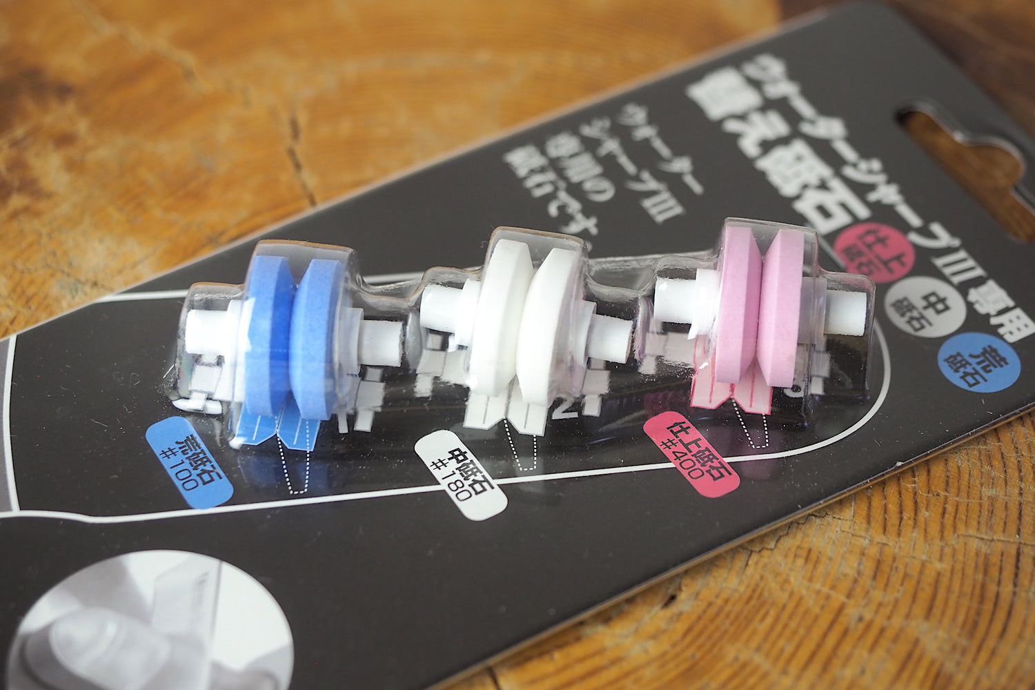 This sharpener has 3 wheel-shaped stones: rough (blue), standard (white) and fine (red). Please grind the blade with back and forth motion 7 rounds each in the order of rough-standard-fine.