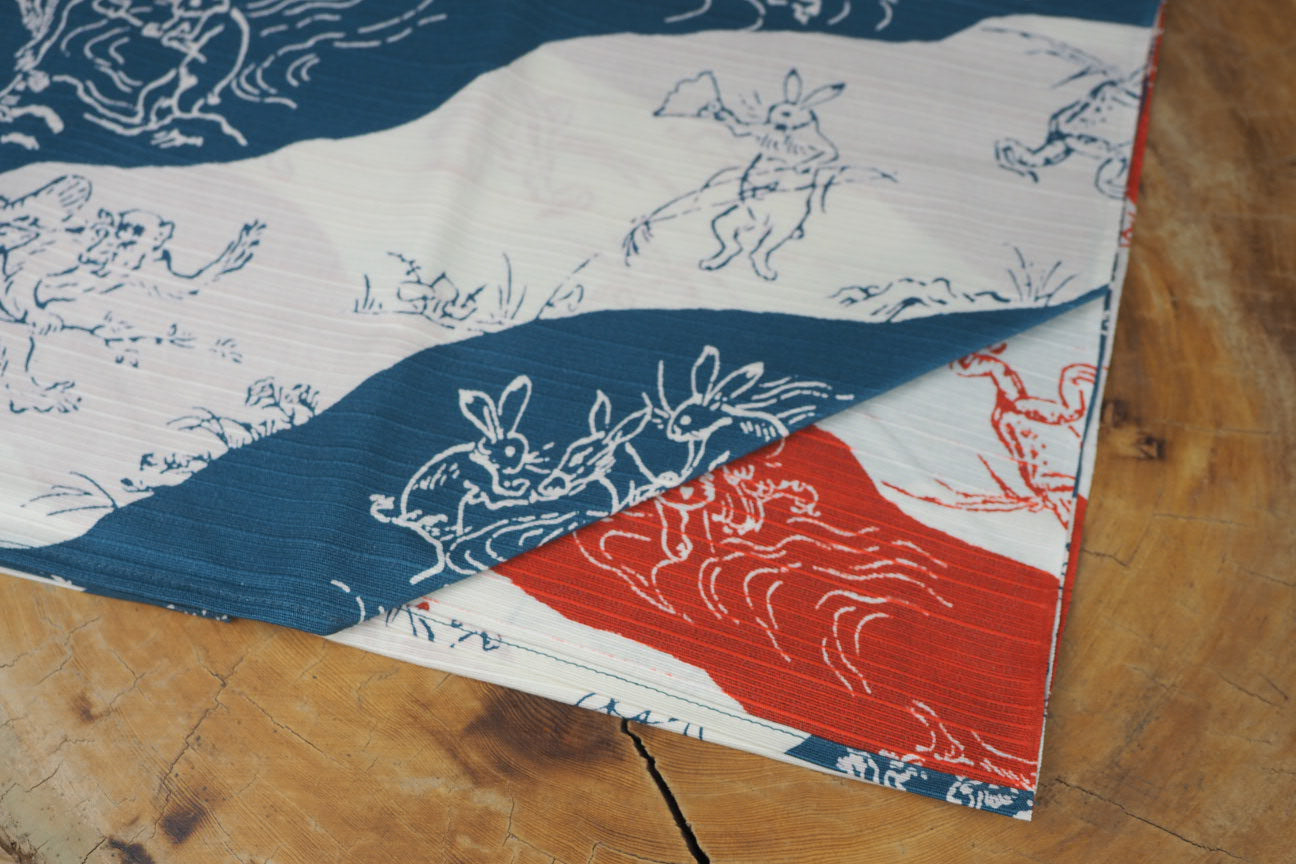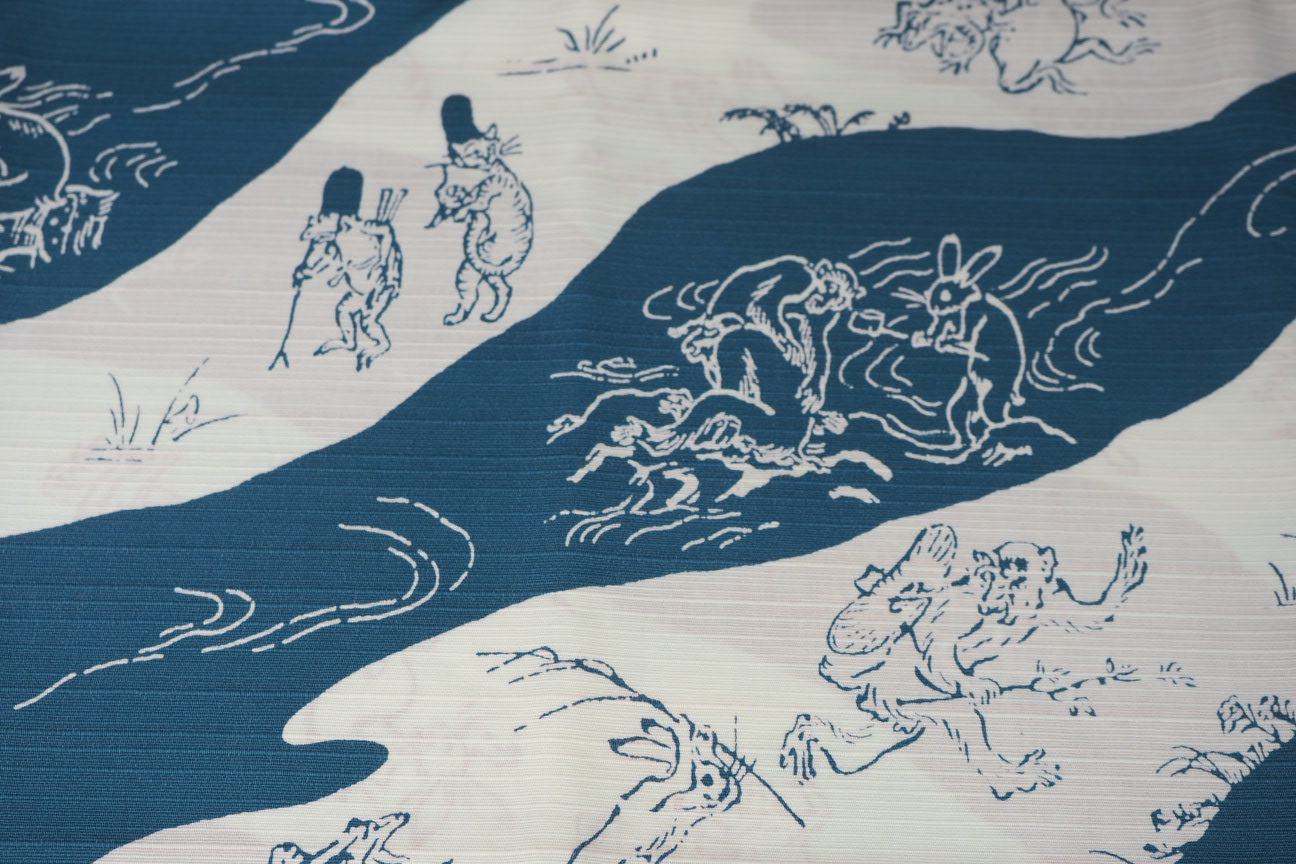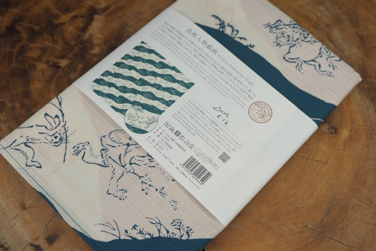 "The Choju-Jinbutsu-Giga is a satirical picture scroll created in Japan 800 years ago. It continues to attract attention today due to its rich portrayal and expressive mastery of lines. The anthropomorphized rabbits, monkeys, and frogs, seemingly embodying the people of that era, energetically frolic across the cloth, conveying the spirit of the time even after 800 years."