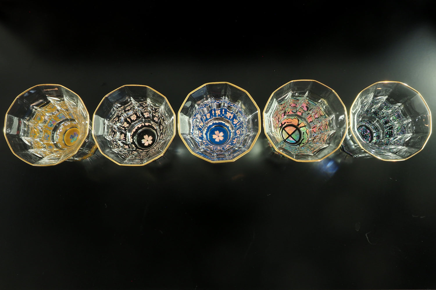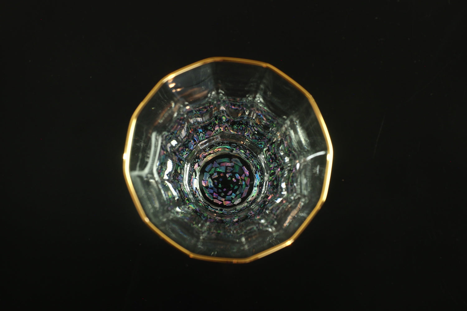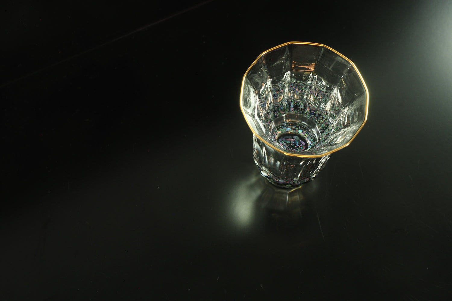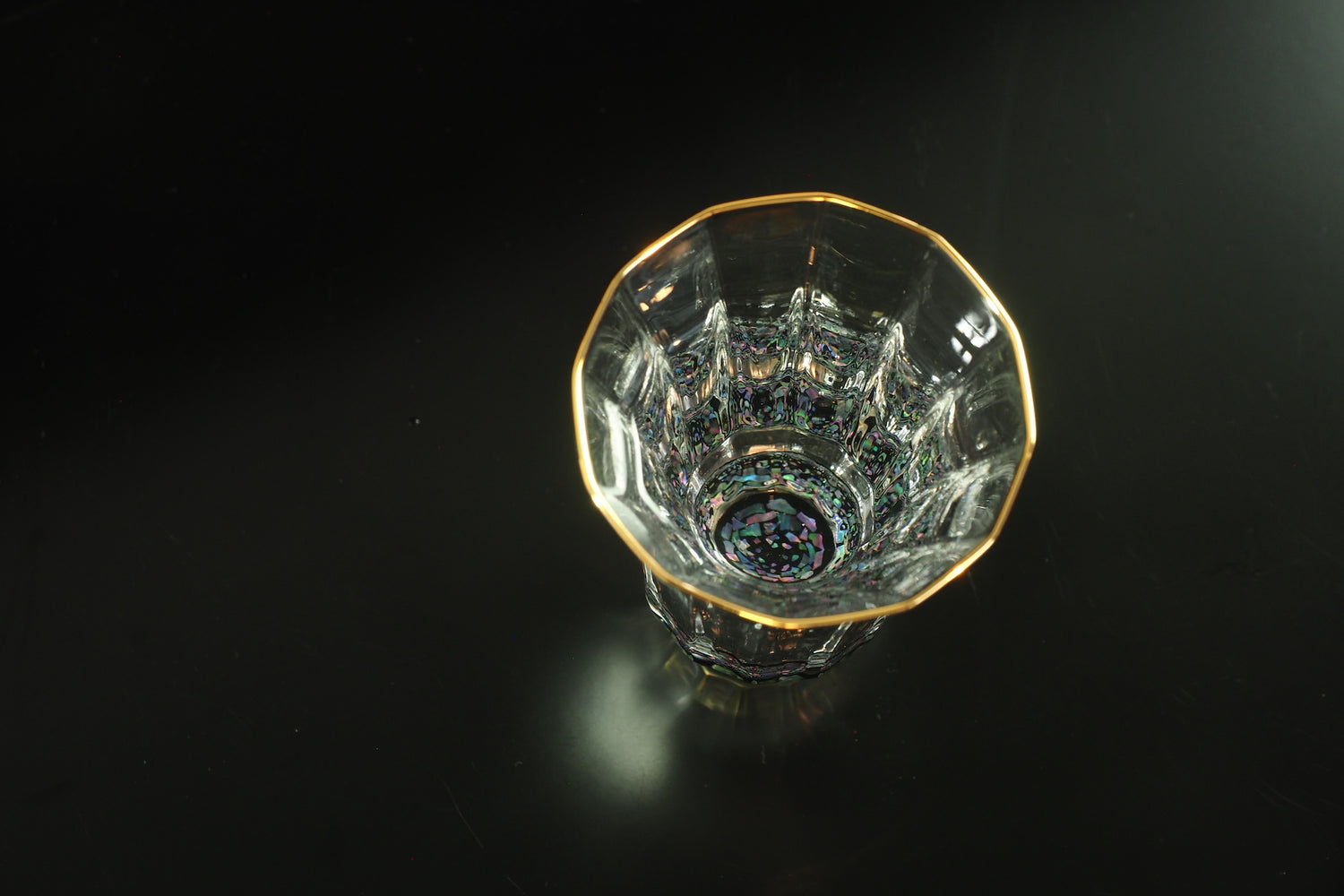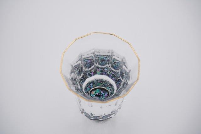 Raden glass incorporates application of thinly-stripped abalone shells on the bottom of glassware finished with lacquer. Uniqueness of rainbow-coloured seashells and warmth of lacquer give an impression of luxury gem to a modern glass material. The glitter of Raden patterns creates a mysterious image, which will beautifully appear throughout the glass when you pour sake (or any kind of drinks).