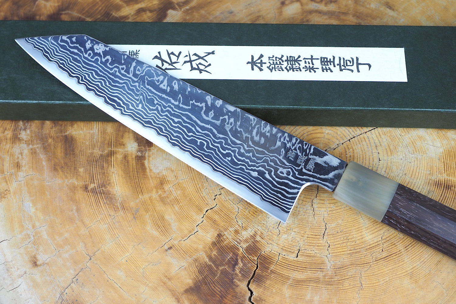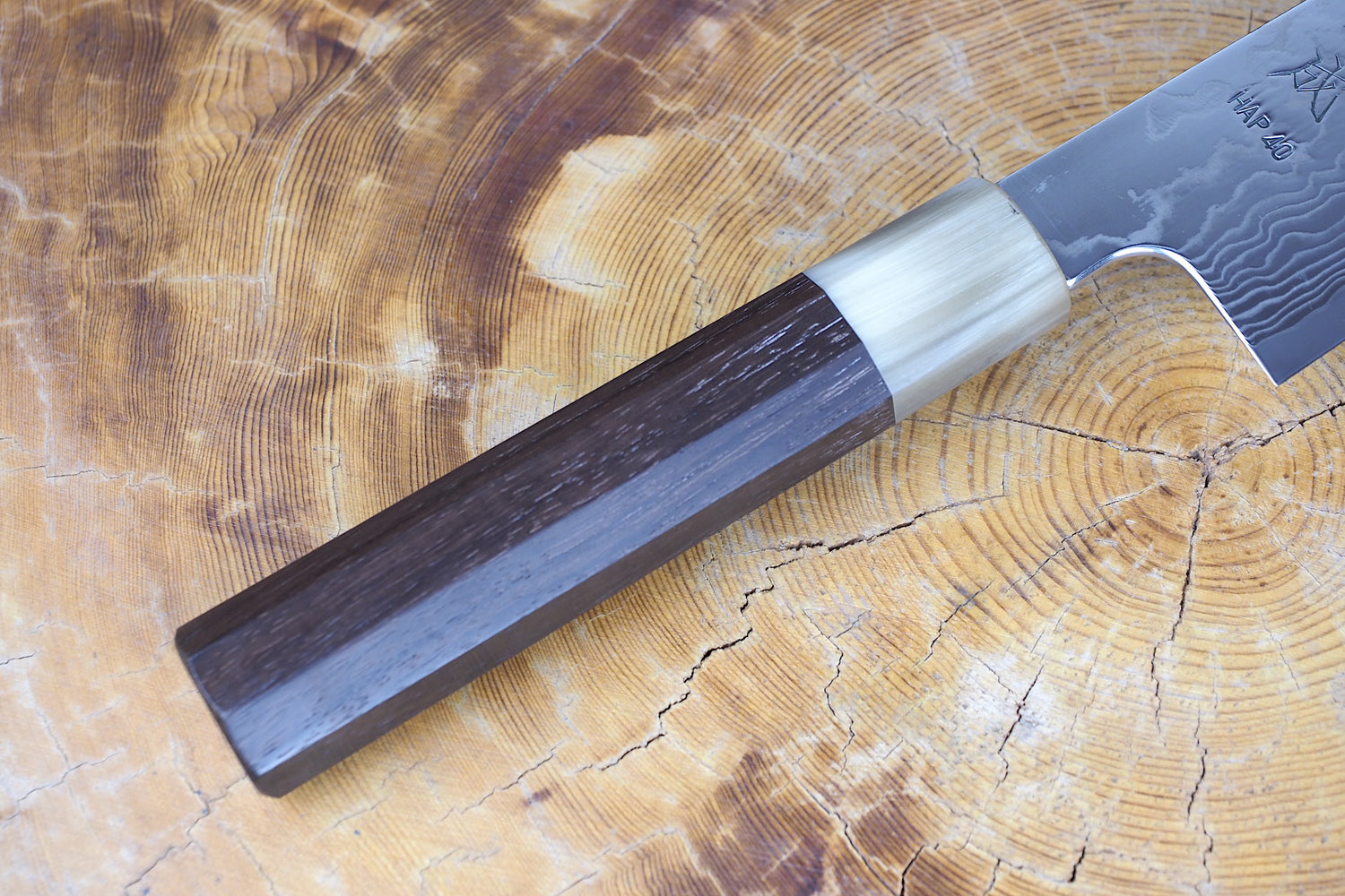 Sukenari HAP40 Mirror-Polished Damascus Powdered High Speed Steel Kiritsuke (K-tip) Gyuto Chef's knife (21cm) with Rosewood & Buffalo Horn Handle