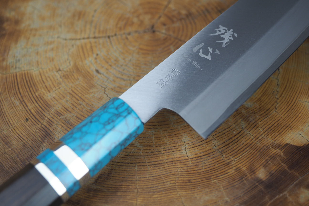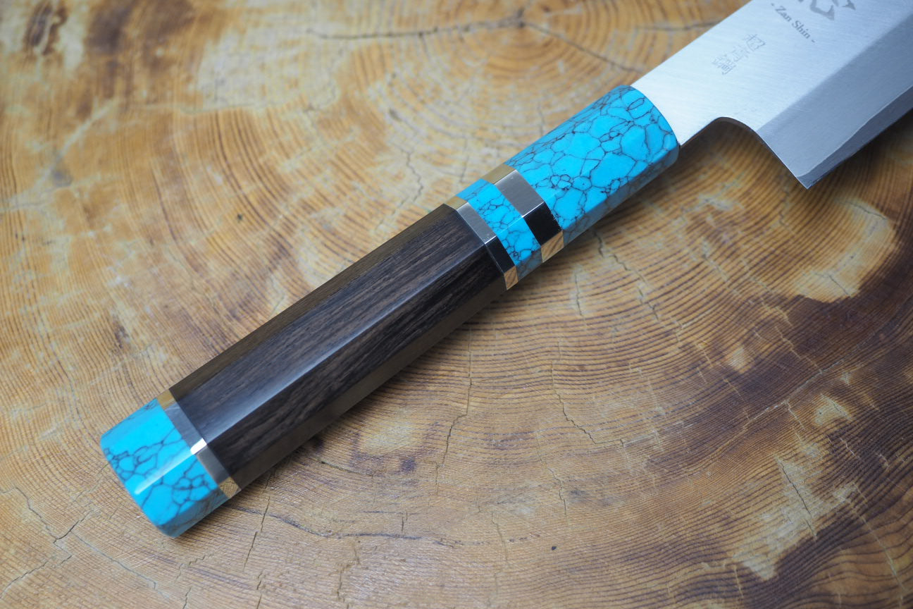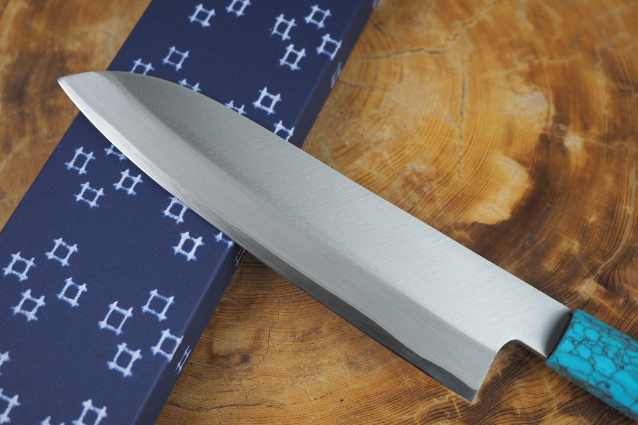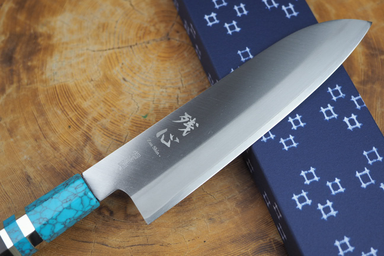 残心 Zan Shin REN (from Seki) - Blue Super steel Santoku with Ebony & Blue Turquoise-colour Handle 18cm